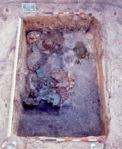 Tutto il resto del ricchissimo corredo era collocato accanto al cinerario, in uno spazio dal fondo ribassato, un loculo di circa m. 3,60 x 1,30, con gli oggetti collocati gli uni molto vicini agli altri e sovrapposti. La fossa era coperta presumibilmente da un tavolato ligneo, il cui crollo ha determinato lo stato in cui gli archeologi hanno ritrovato la tomba al momento della scoperta: i vasi ceramici in frammenti, gli oggetti in ferro e bronzo schiacciati, rotti, deformati e spesso aderenti e in sovrapposizione tra loro. La corrosione e i fenomeni di degrado del bronzo e del ferro hanno ulteriormente pregiudicato lo stato di conservazione dei reperti metallici.