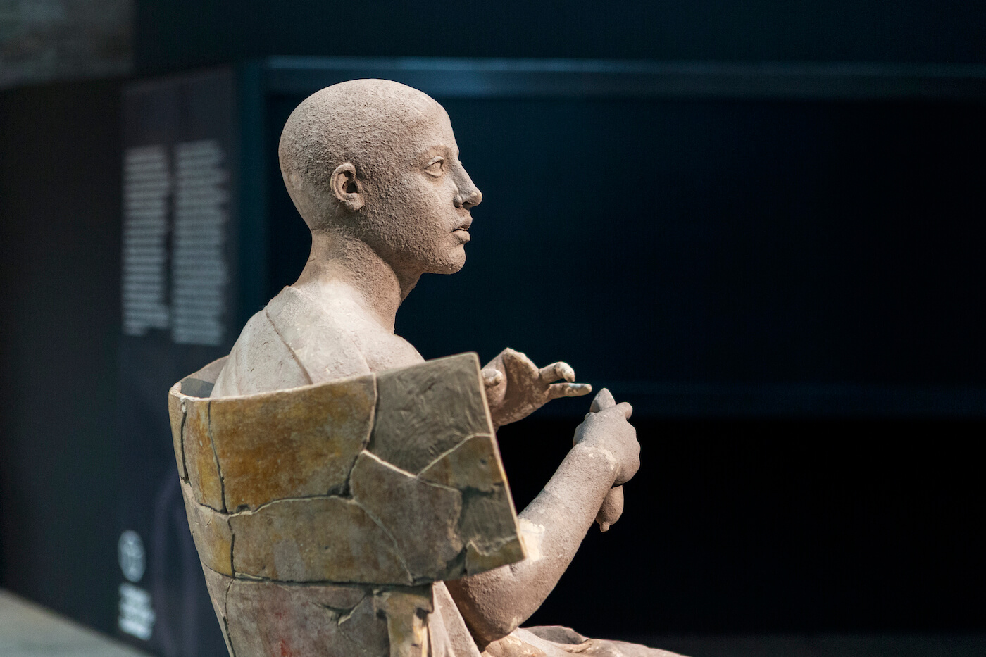 Il gruppo scultoreo in terracotta raffigura Orfeo – il mitico cantore che, con la sua voce, poteva domare persino Cerbero, il feroce cane degli Inferi – e due Sirene – spaventosi esseri mitologici dalla voce così incantevole da far impazzire i marinai che passavano accanto a loro. Secondo il mito, Orfeo avrebbe sconfitto le Sirene durante il viaggio di ritorno degli Argonauti, nei pressi di un’isola della Sicilia o dell’Italia del Sud. La vittoria di Orfeo sulle Sirene rappresenta simbolicamente il trionfo dell’armonia musicale, un concetto chiave del pensiero filosofico e politico pitagorico, particolarmente diffuso nelle città della Magna Grecia. L’opera è stata prodotta proprio in questo ambiente greco d’Occidente, più precisamente in un atelier di Taranto, dove in effetti sarebbe stata scoperta. Proveniente forse da un monumento funerario o da un santuario, si data alla fine del IV secolo a.C.