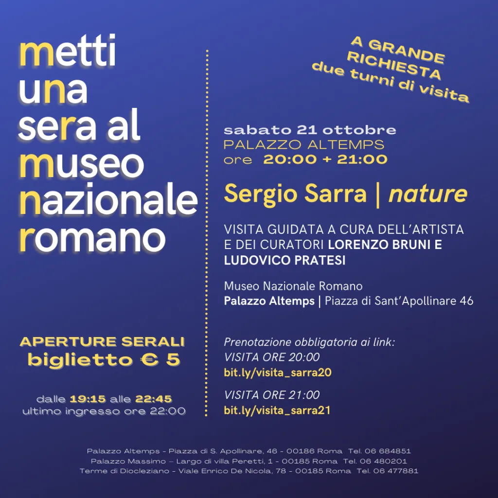 In occasione delle aperture straordinarie serali del MNR al costo speciale di 5 €, nella sede di Palazzo Altemps sabato 21 ottobre l’artista Sergio Sarra e i curatori Lorenzo Bruni e Ludovico Pratesi, organizzano una visita guidata d’eccezione alla mostra nature, in corso al piano nobile del Palazzo fino al 12 novembre.