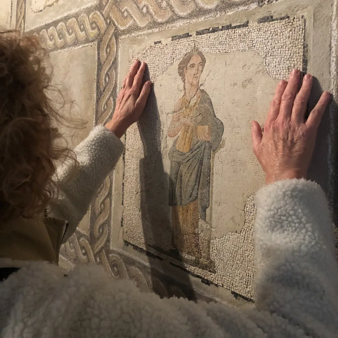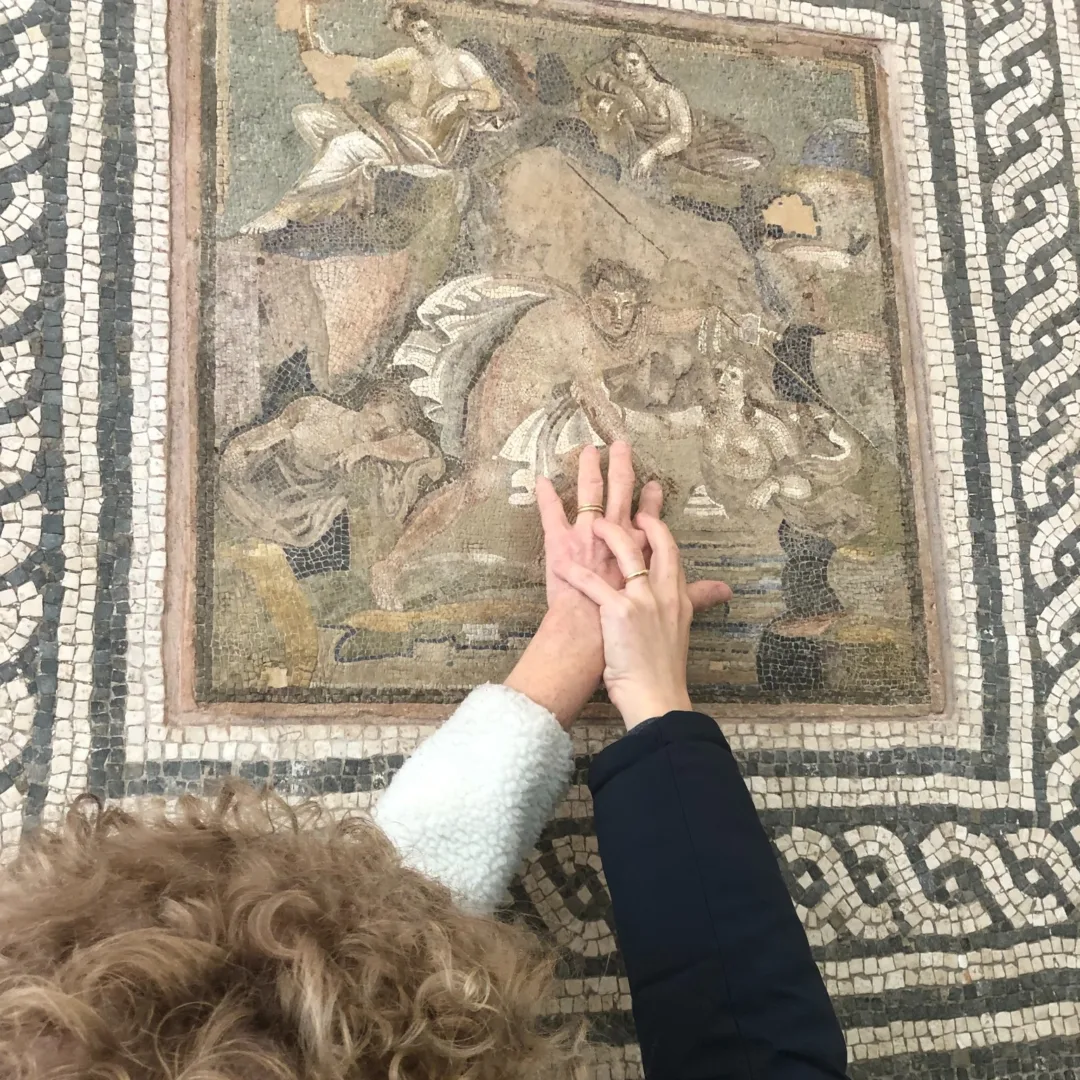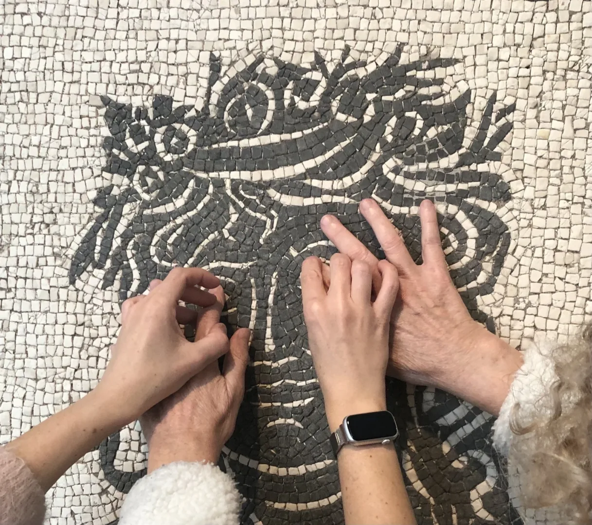 La visita, organizzata dal Servizio Educativo del Museo Nazionale Romano in collaborazione con Stefania Vannini, Responsabile di programmi di Accessibilità della Galleria Borghese, è stata svolta da Carlotta Caruso, del Servizio Educativo MNR e dalla stessa artista Christina Nakou, e ha permesso di entrare in contatto tattile con alcuni dei mosaici antichi del Museo e il mosaico contemporaneo di Antikythera, che sta prendendo forma nell’Open Studio.