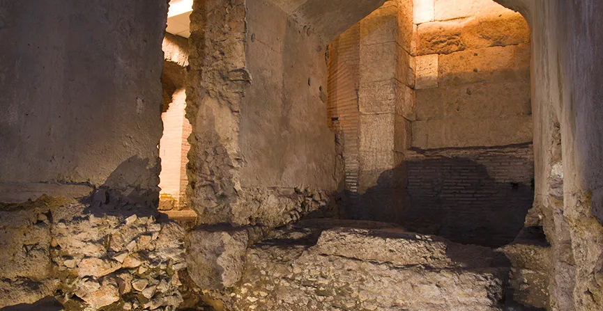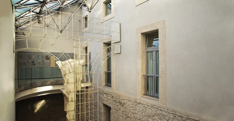 Il Museo racconta e conserva al suo interno le tracce delle strutture, degli edifici e dei monumenti che si susseguirono in questa area nel corso di duemila anni. L’isolato, compreso tra via delle Botteghe Oscure, via Caetani, Via dei Delfini e via dei Polacchi, si trasforma in un racconto, anche verticale, che si sviluppa nell’edificio stesso del Museo, a partire dai sotterranei con i resti del portico del Teatro di Balbo e della Porticus Minucia Frumentaria, proseguendo lungo i diversi piani attraverso i complessi fortificati e le abitazioni altomedievali e medievali dei mercanti, fino a giungere all’età moderna, con il dormitorio seicentesco del monastero di Santa Caterina, in cui sono state ricavate le sale museali.
