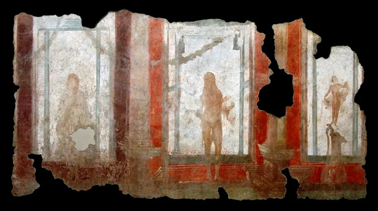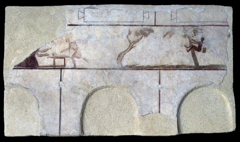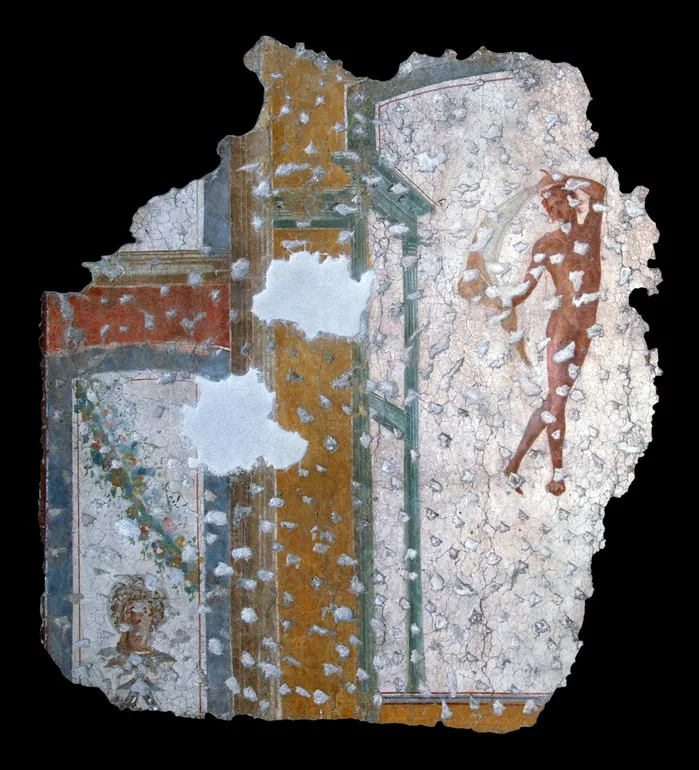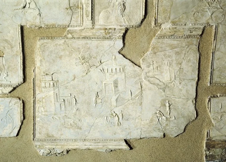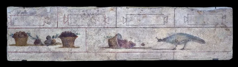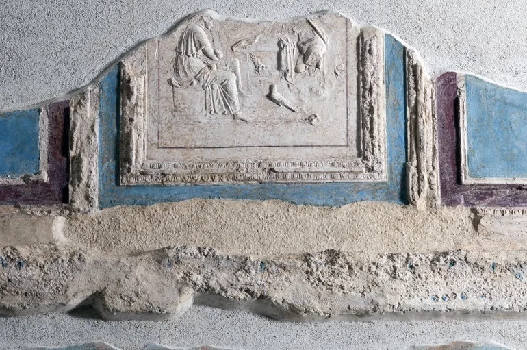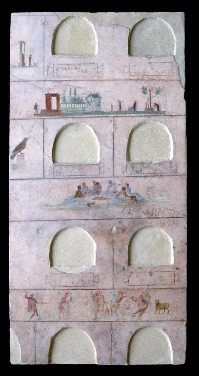 In the long walls of the burial building from the 1st century AD, landscape scenes alternate with burial niches for cinerary urns and inscriptions with the names of the dead.
