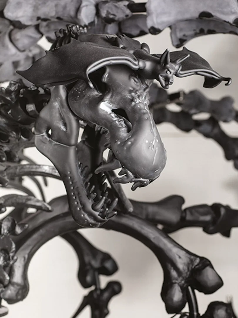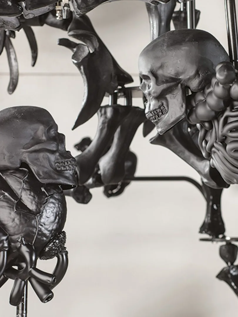 Spogliata dalla sua esteriorità, l’umanità ci appare in quelle forme che si trovano in ognuno di noi: una tortuosa cascata di ossa e visceri. Ma La Commedia Umana non vuole essere un monumento alla perdita, quanto un ammonimento: pensare al futuro, ricordarci di lavorare con gli altri perché del nostro passaggio non rimangano solo poche ossa a farsi beffa di noi. Ed è proprio in quel groviglio di ossa e in quel sorriso beffardo che La Commedia Umana si specchia e dialoga con una delle opere più note del Museo Nazionale Romano, il mosaico dalla Via Appia dove uno scheletro sdraiato punta il dito sull’iscrizione “gnothi sauton”: conosci te stesso e godi della tua natura mortale finché ti è possibile.