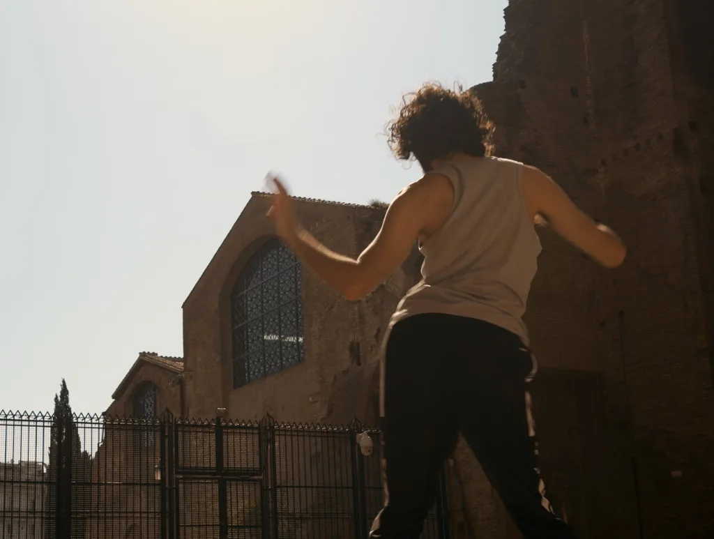 Nelle sue opere, Saeger ama creare situazioni di prove. Per questo progetto ha invitato nel suo studio ballerini italiani di diversi background per esplorare e discutere insieme i rispettivi stili di danza. Nel momento in cui le coreografie apprese abbandonano il “save space” dell’atelier sorgono domande sulla rappresentazione e la visibilità nello spazio pubblico, domande che sono influenzate dalla collaborazione con i rappresentanti della comunità queer di Roma. I corpi e i movimenti dei ballerini sono al centro dell’attenzione e sono supportati da opere tessili dell’artista belga Ruth Vieren. I materiali e le strutture utilizzate dialogano con lo spazio, il contesto e la materialità delle terme e, con la loro forma fluida, simile alla performance stessa, permettono ai ruoli di genere di sfocarsi nell’acqua.