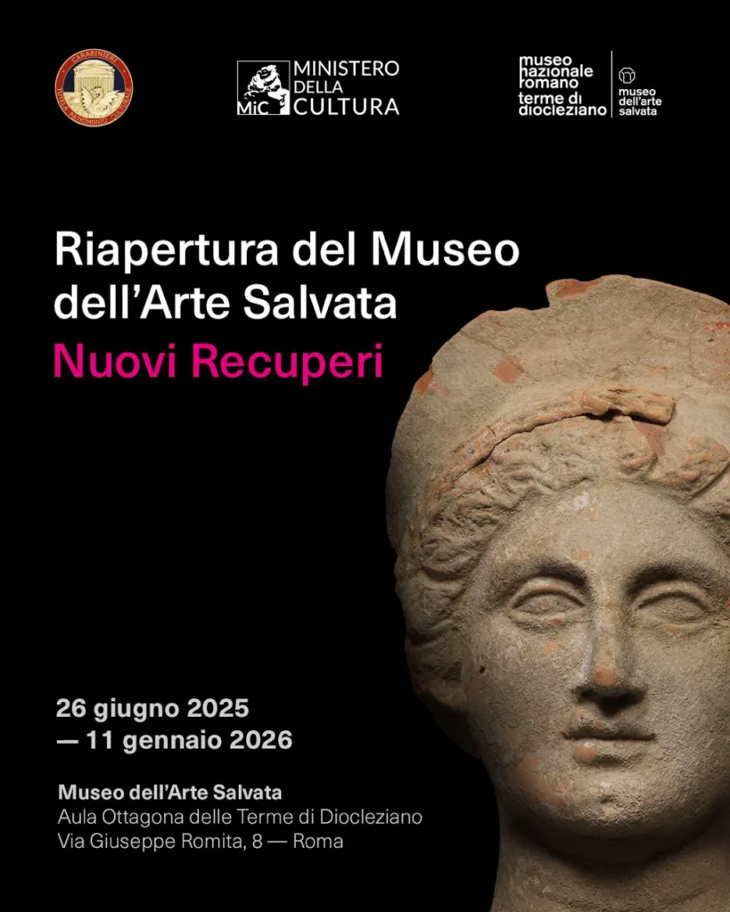 Il 26 giugno il Museo dell’Arte Salvata nell’Aula Ottagona delle Terme di Diocleziano riapre al pubblico. Il Museo fu istituito nel 2022 nell’Aula Ottagona delle Terme di Diocleziano per accogliere a rotazione l’esposizione di opere d’arte sottratte a calamità naturali o antropiche come guerre, saccheggi o furti. L’occasione per la riapertura è una grande esposizione, dal titolo Nuovi recuperi, a cura di Sara Colantonio e Maria Angela Turchetti.