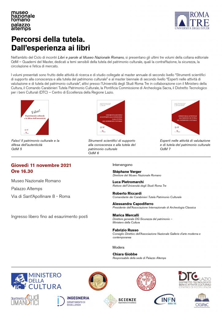 Nell’ambito del Ciclo di incontri Libri e parole al Museo Nazionale Romano, si presentano gli ultimi tre volumi della collana editoriale QdM – Quaderni del Master, dedicati a temi sensibili della tutela del patrimonio culturale, quali la contraffazione, la sicurezza, la circolazione e l’etica di mercato.