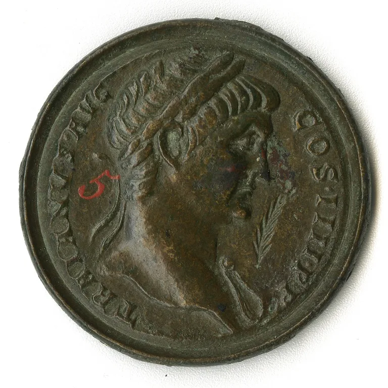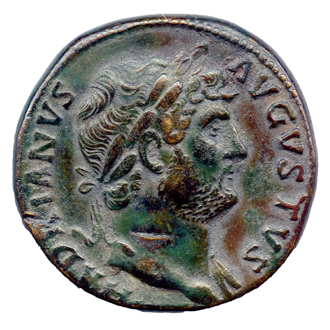 Roma. Sesterzio in bronzo di Adriano con ritratto dell’Imperatore (dritto), 125-128 d.C. Medagliere del Museo Nazionale Romano