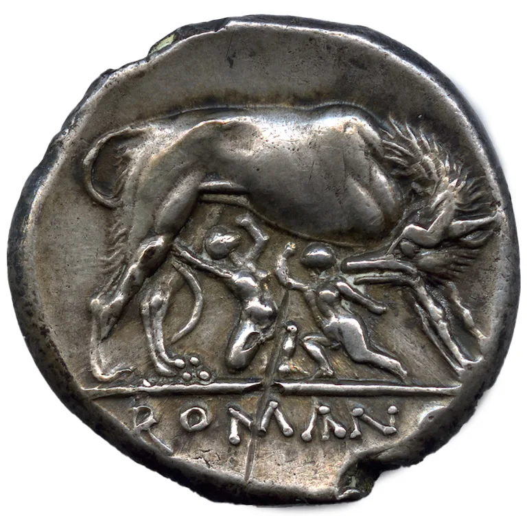 Roma. Didracma in argento con Lupa che allatta i gemelli (rovescio), prima metà del III sec. a.C. Medagliere del Museo Nazionale Romano