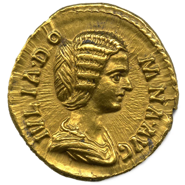 Roma. Aureo di Settimio Severo con ritratto della moglie Giulia Domna (dritto), 193-196 d.C. Medagliere del Museo Nazionale Romano