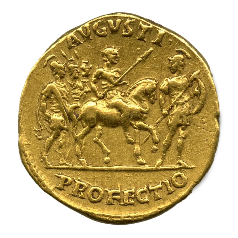 Roma. Aureo di Traiano con scena di profectio dell’Imperatore (rovescio), 114 d.C. Medagliere del Museo Nazionale Romano